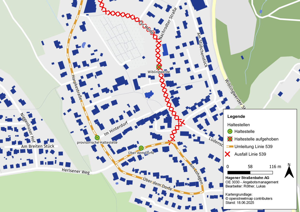 Aufgrund einer Fahrbahnsanierung auf der Nachrodter Straße in Wiblingwerde kann die Linie 539 von Mittwoch, den 12.11. (Betriebsbeginn), bis auf Weiteres nicht die (H) Wiblingwerde anfahren.