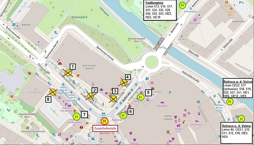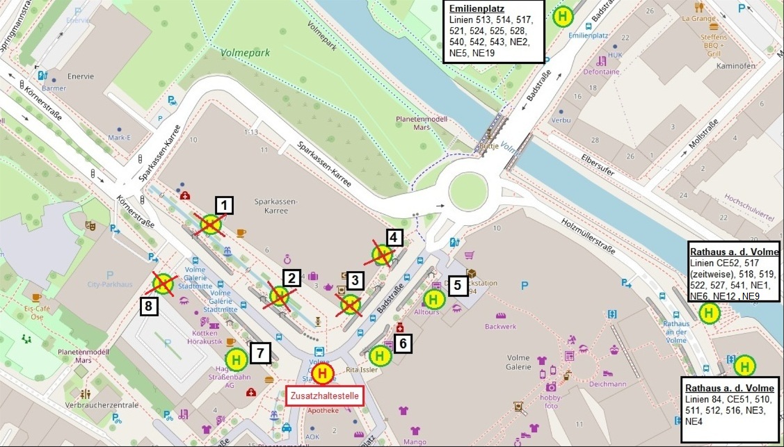 Die HST bittet darum, in Richtung Hauptbahnhof auf die umliegenden Haltestellen „Emilienplatz“ (Linien 513, 514, 525, 527, 521, 524, 525, 528, 540, 542, 542, NE2, NE5, NE11, NE19) oder „Rathaus an der Volme“ (Linien CE51, CE52, 84, 510, 511, 512, 516, 518, 519, 522, 527, 541, NE1, NE3, NE4, NE6, NE9, NE12) auszuweichen. Auch die Haltestelle „Volkspark“ befindet sich im näheren Umfeld und kann alternativ genutzt werden.